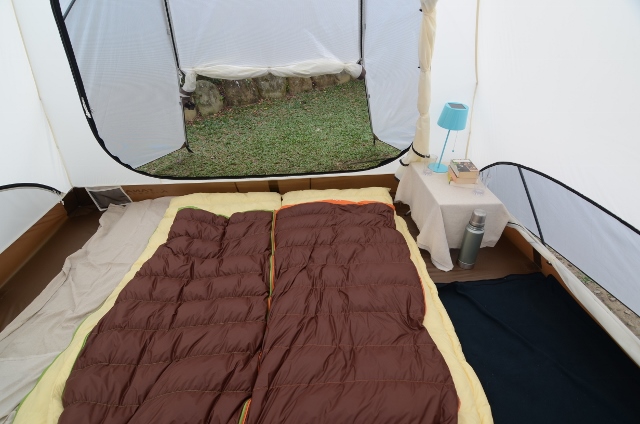帳篷內睡覺時使用的配備,包含充氣床墊、枕頭、睡袋以及夜燈...等。