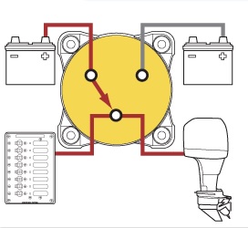 - 當引擎發動時切換開關至結合(1+2),同時充兩組電瓶。如果停留在電瓶1或2,只有一組電瓶會充電。可以裝一個電瓶整合器或隔離器來自動充兩組電瓶。