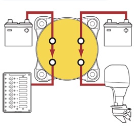 電瓶隔離器也是讓單一充電來源充多組電瓶。想像它就像一個閘閥,讓電流從發電機流向兩組或三組電瓶,每組電瓶看不到對方。