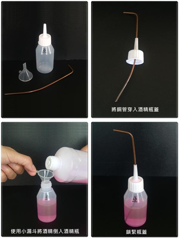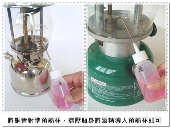 預熱酒精瓶組6C LAB6C 煤油氣化燈爐預熱用 附漏斗方便倒酒精 煤油燃料的氣化燈/爐,使用酒精預熱,可減少打氣的次數(不用噴火槍) 此酒精瓶組為倒入預熱杯引導之工具。 小孔徑銅管可抑止回火 此酒精瓶如果受擠壓酒精會溢出。 尺寸:酒精瓶60ml 配件:小漏斗 產地:台灣