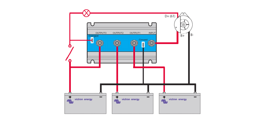 - 有些發電機在B+輸出端上需要感應到直流電壓才會開始充電。 發電機直接接在電瓶上一定會有直流電壓存在。 當裝上二極體或FET隔離器時會避免任何電壓/電流從電瓶回到B+輸出端,所以發電機不會啟動。 Argofet隔離器有個限定電流的發電機通電輸入(alternator energize input),當按下引擎啟動/停止開關時,它會通電至B+輸出端。