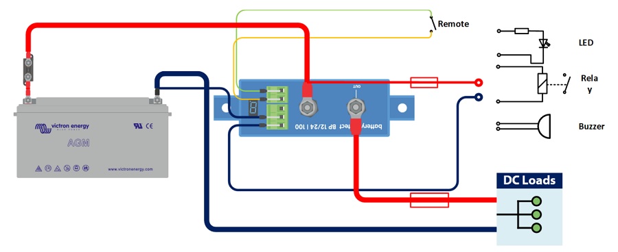 - 電瓶保護器為單向設備。它只能處理單一方向的電流:要嘛是流向負載的電流,或是來自充電器的電流,但不能同時處理兩個方向的電流。此外,電流只能從Battery端流向Load端。若用於負載,電瓶需接在Battery端;若用於充電器,充電器則需接在Battery端。