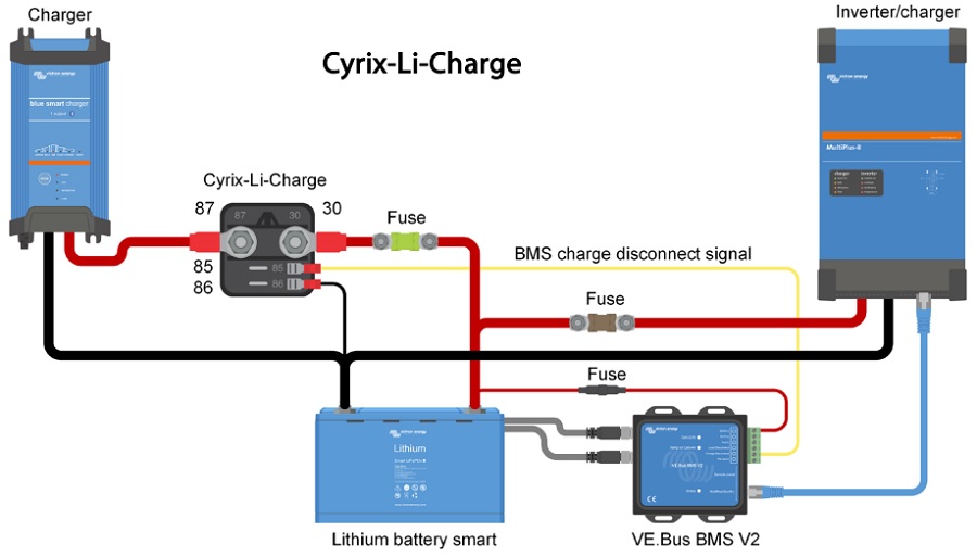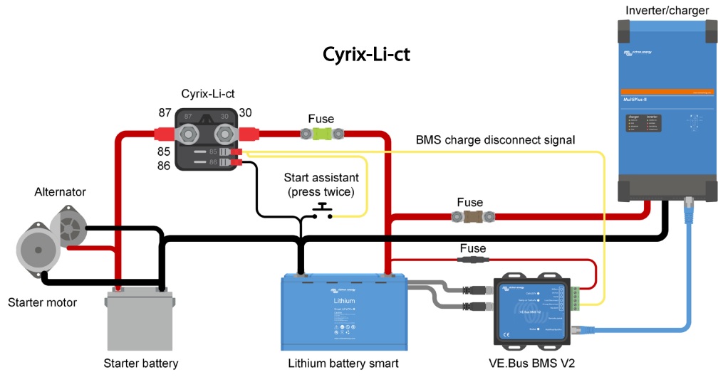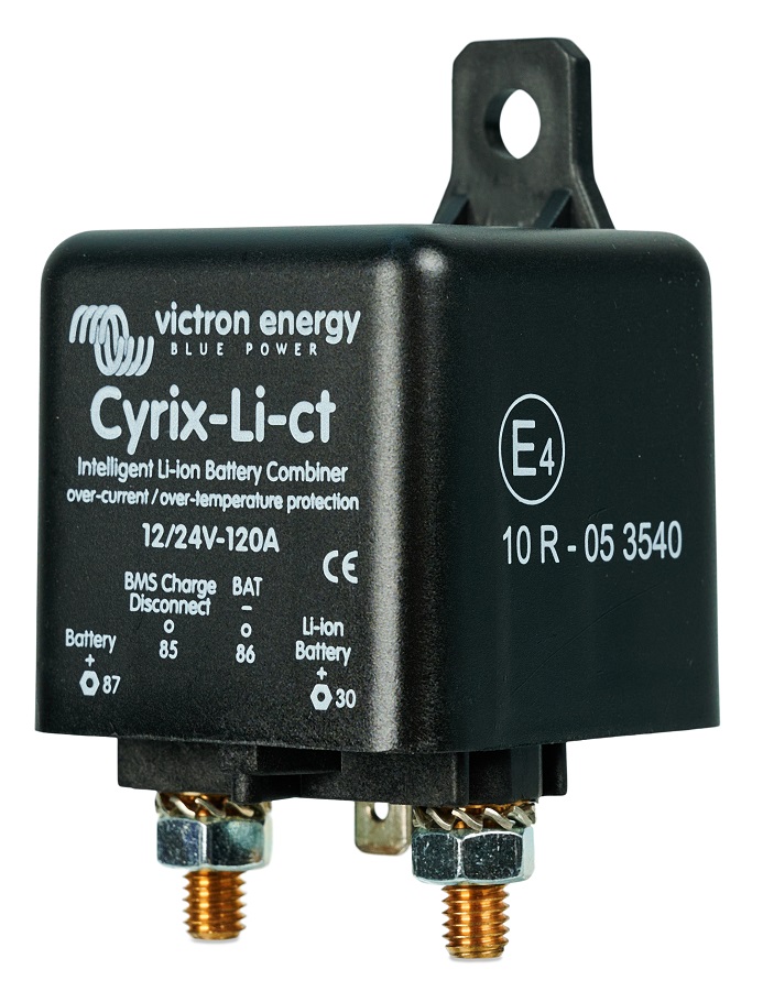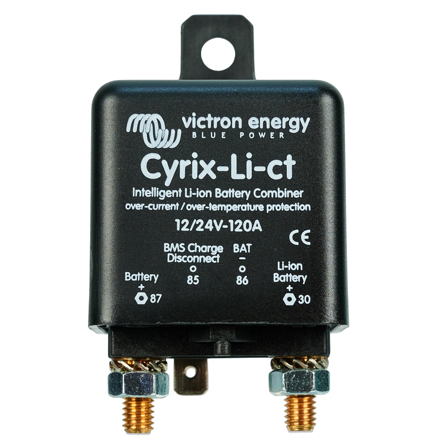 - Cyrix電瓶整合器(Battery Combiner)是一種由微處理器控制的重載繼電器。當其中一顆電瓶達到預設電壓(表示該電瓶正在充電)時,系統會自動將電瓶並聯連接;當電壓下降至浮充電壓以下(表示一顆或多顆電瓶正在放電)時,則會自動斷開連接。Cyrix電瓶整合器是二極體隔離器的理想替代方案。其主要特色在於幾乎沒有電壓損失,因此發電機或電瓶充電器的輸出電壓無需額外提高。