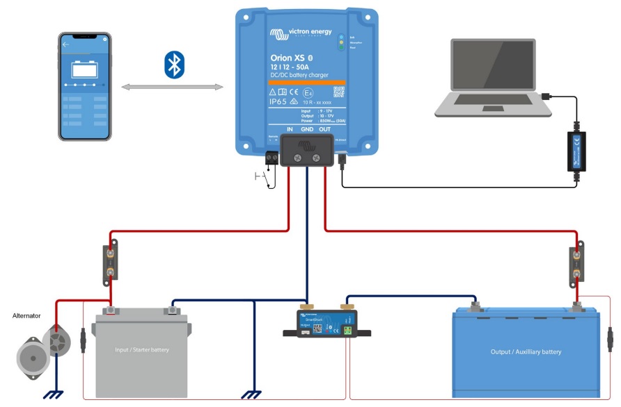 - Orion XS可作為DC-DC電瓶充電器或電源供應器使用,具備寬輸入與輸出電壓範圍。這在搭載Euro 5或Euro 6智慧型發電機的車輛中特別重要,因為此類發電機即使在引擎運轉時,往往仍提供過低的充電電壓;此外,在船舶或露營車中,因電纜距離較長而導致的電壓降也十分常見。在這些情況下,精準且可控的充電對於完整充滿服務電瓶,同時保護啟動/輸入電瓶避免過度放電至關重要。